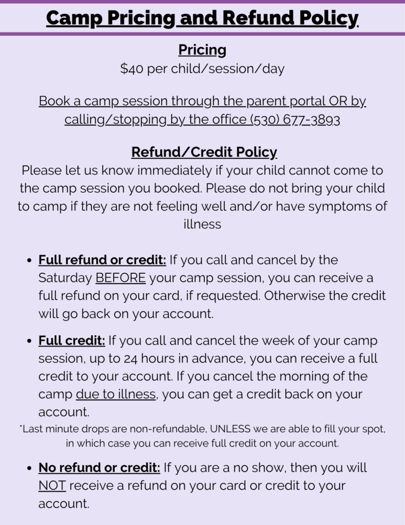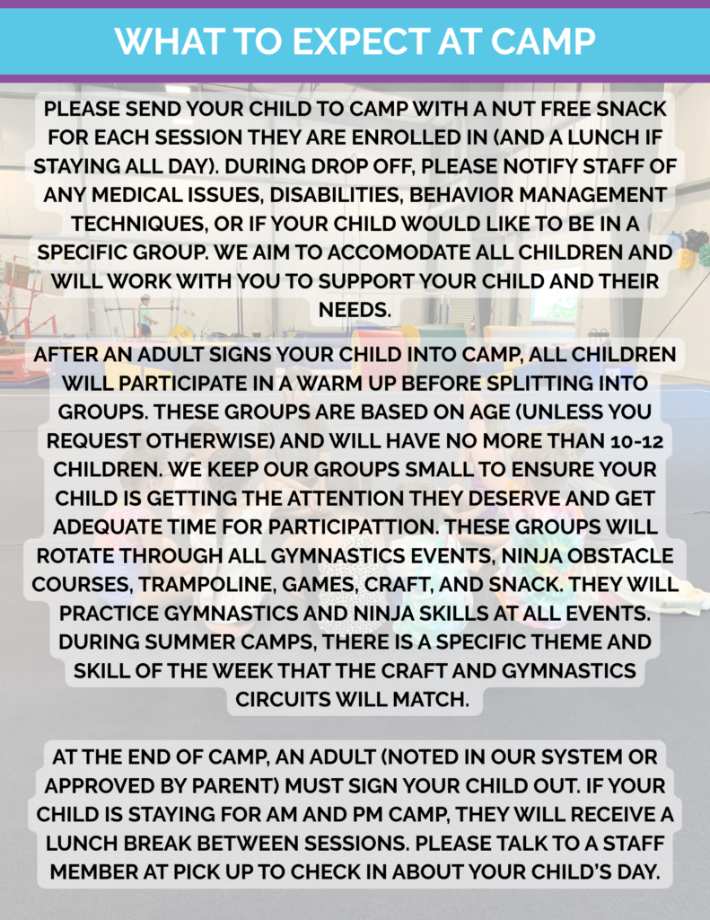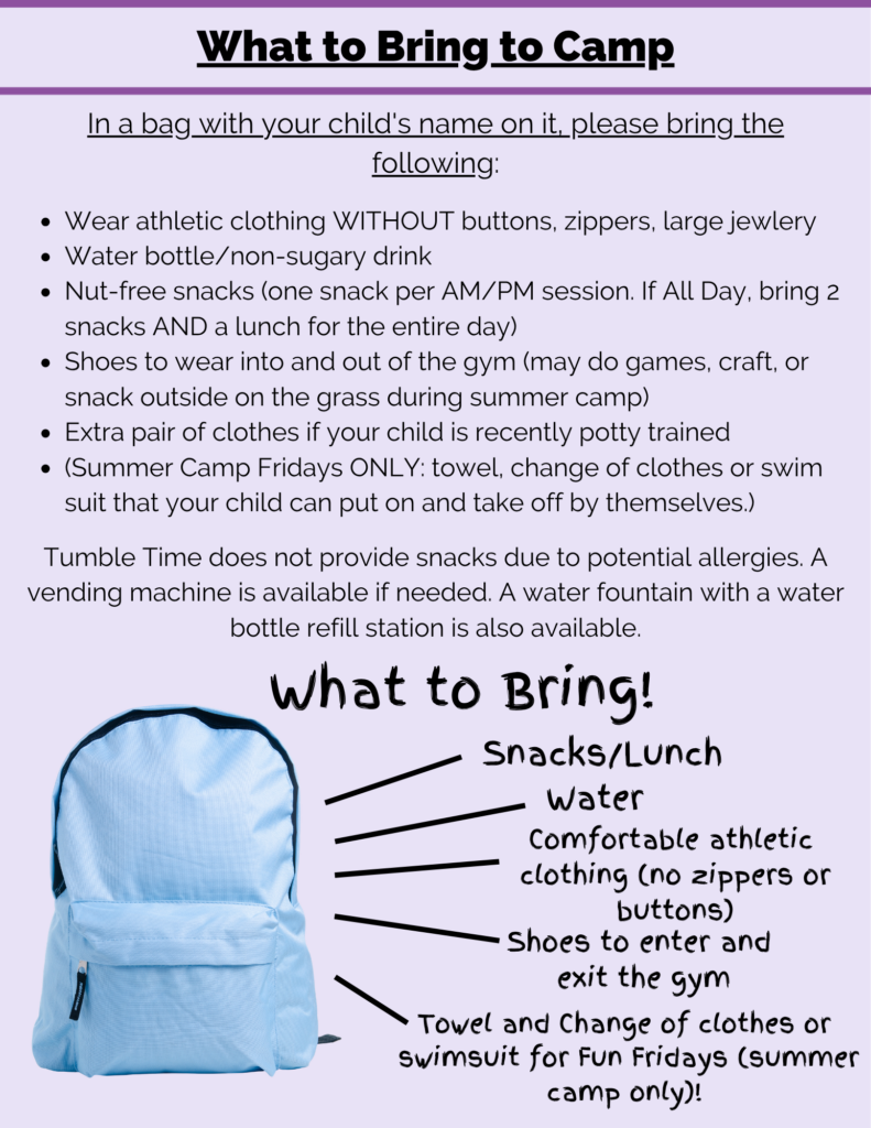 Tumble Time Day Camps are half-day sessions full of fun games and activities, plus lots of gymnastics! We offer both morning and afternoon camps, and you can come to as many or as few days as you would like.