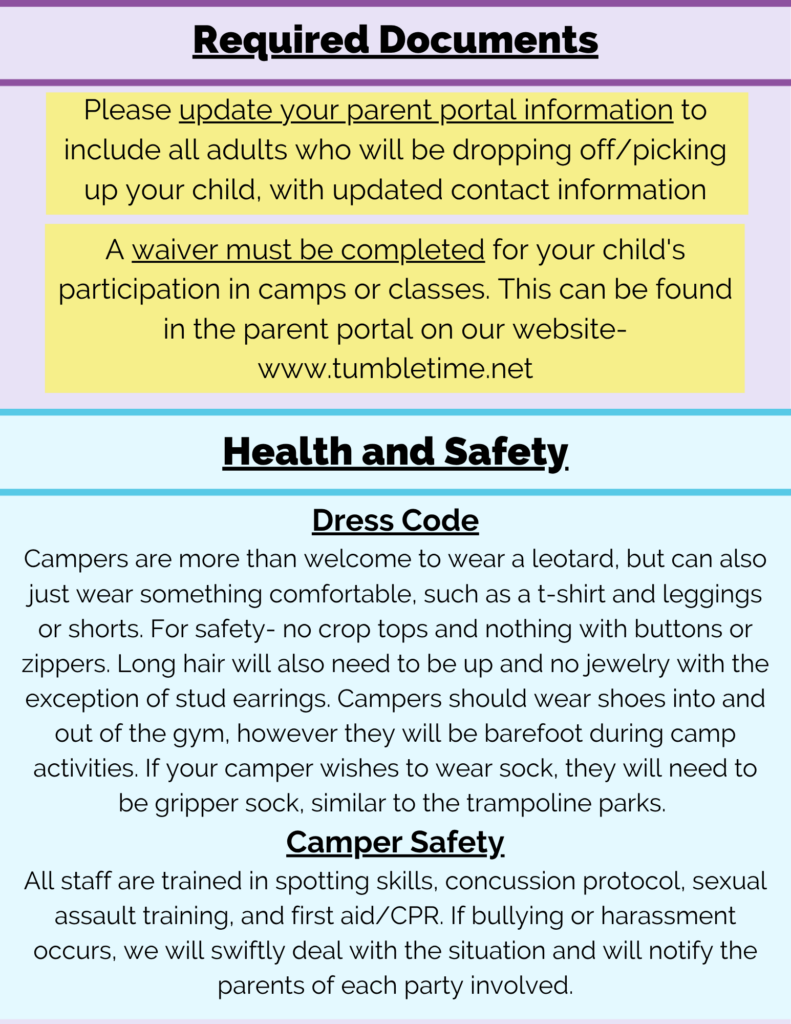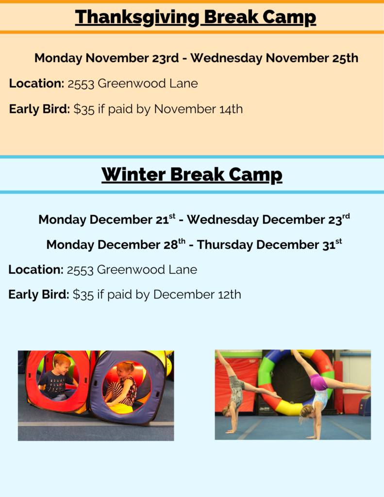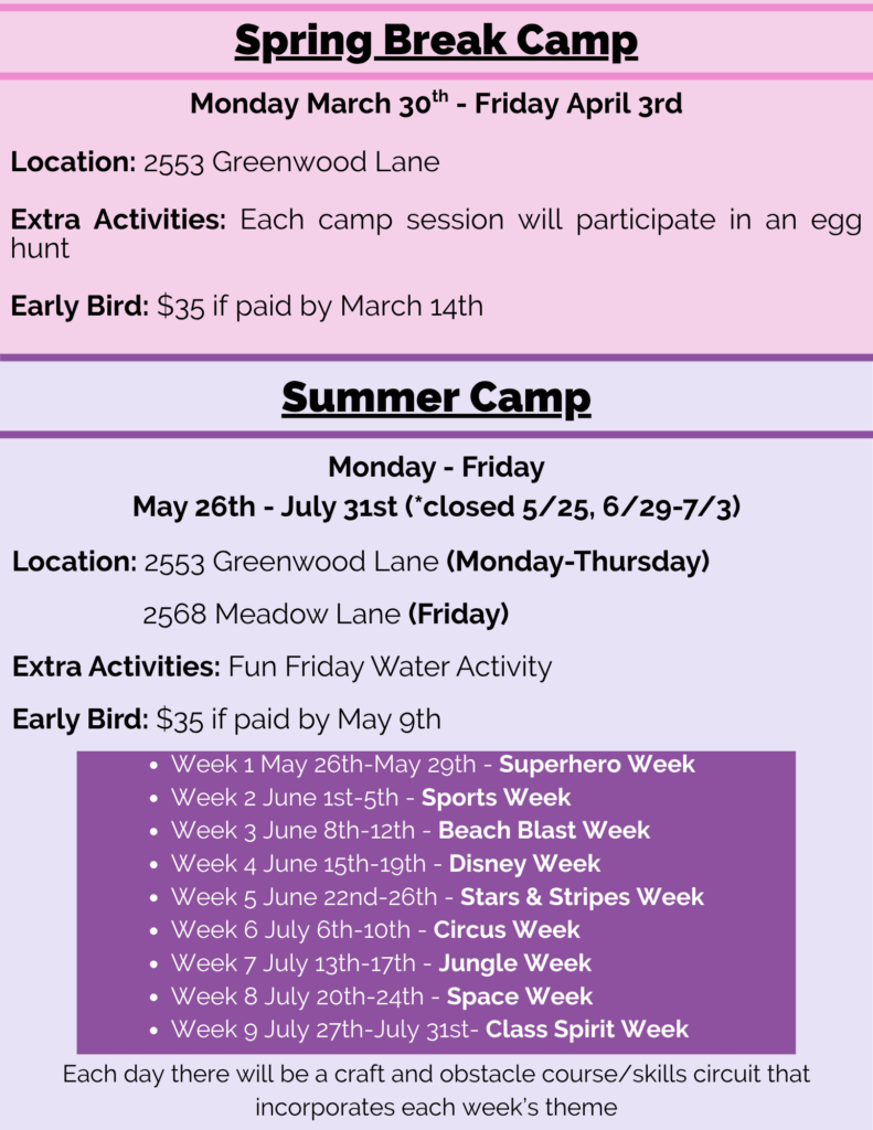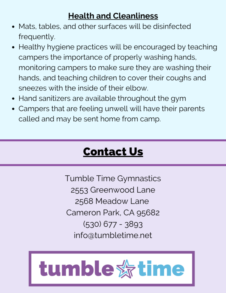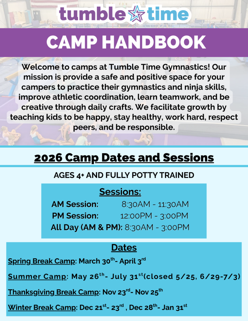 Tumble Time Day Camps are half-day sessions full of fun games and activities, plus lots of gymnastics! We offer both morning and afternoon camps, Monday through Friday, and you can come as many or as few days as you would like. Early bird price of $35 per session, when registered and paid in full by May 9th.